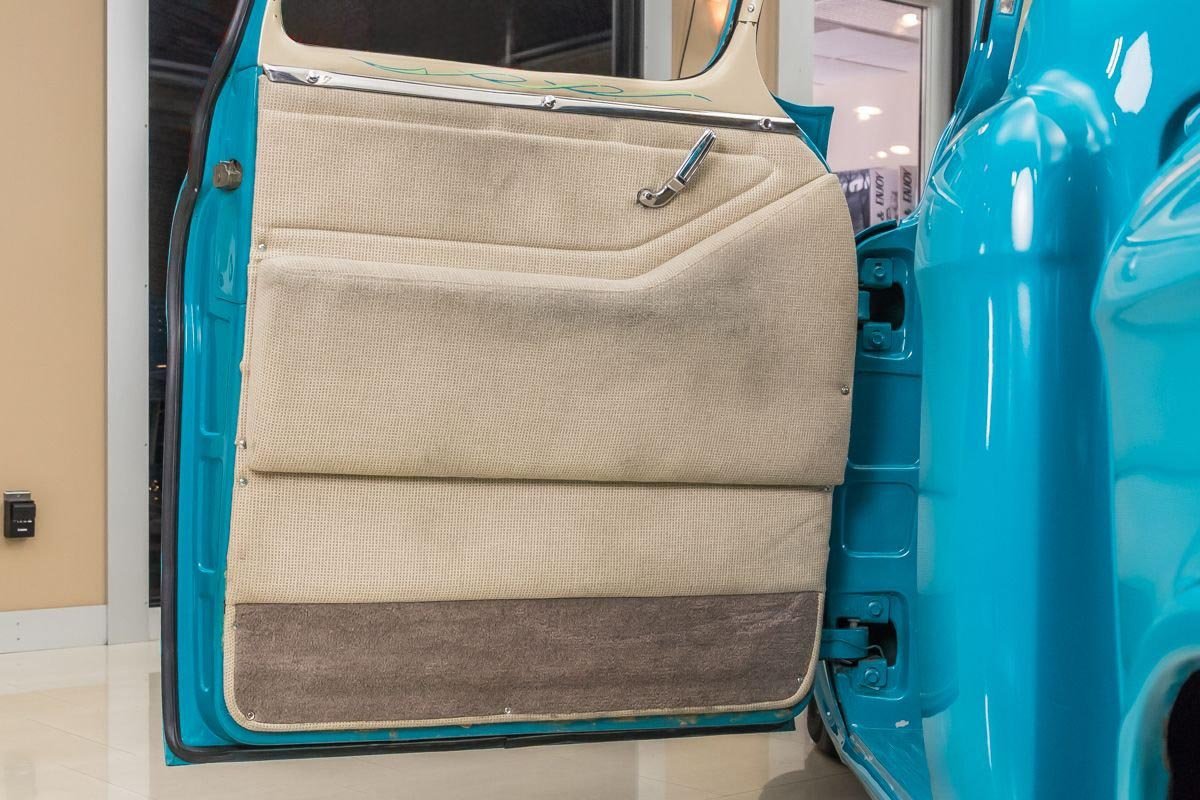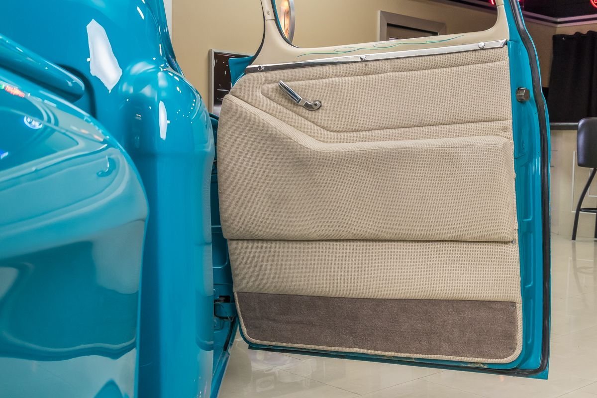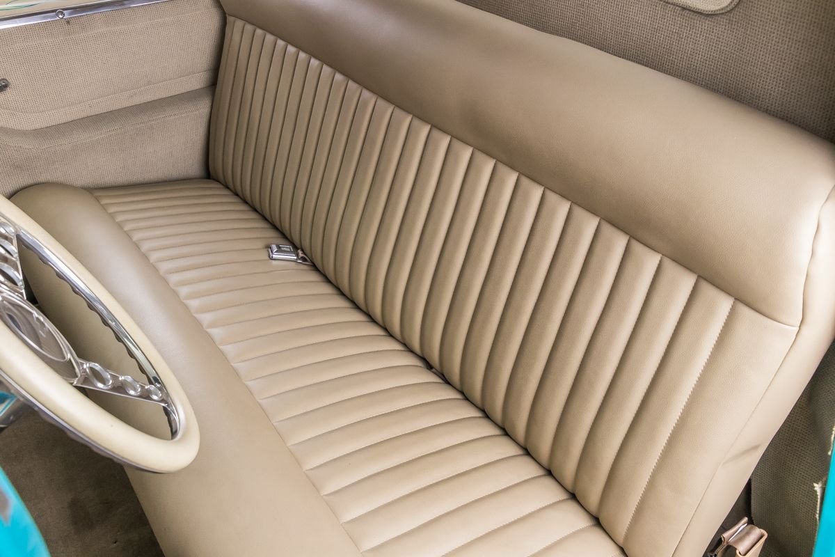 Visually, this truck makes a bold statement. The steel body features extensive custom work, including a lowered stance, shaved details, and a smoothed firewall that give it a clean, aggressive profile. The custom paint and pinstriping highlight the truck’s lines, while the wood bed adds a traditional hot-rod touch. Inside, the tan interior blends classic truck simplicity with modern conveniences, creating a comfortable and well-finished cabin that complements the exterior’s craftsmanship.