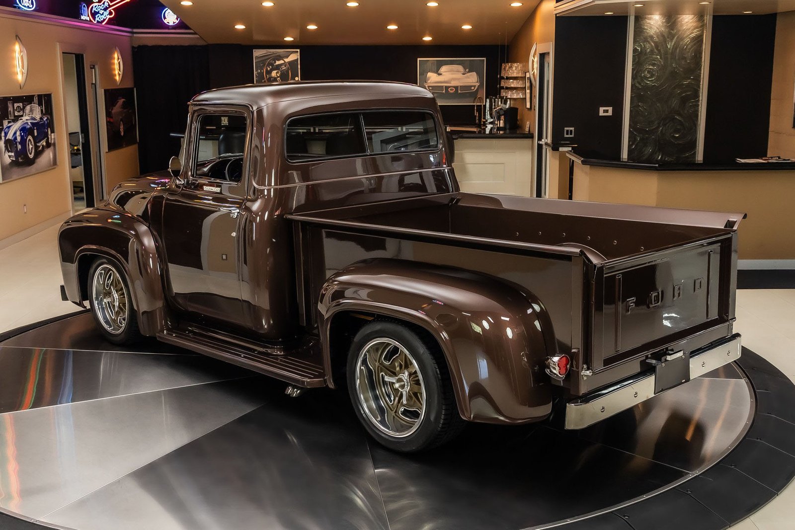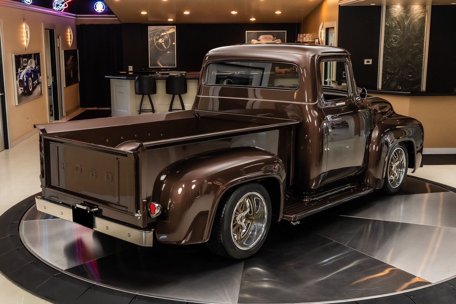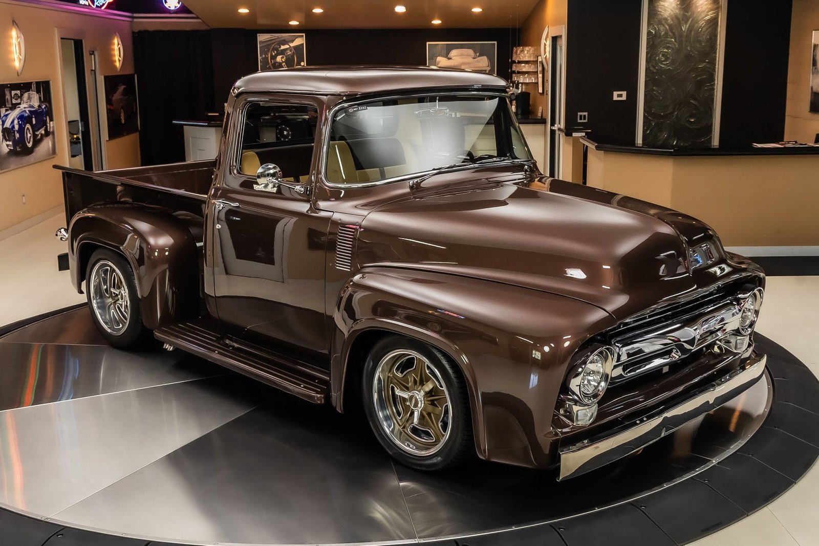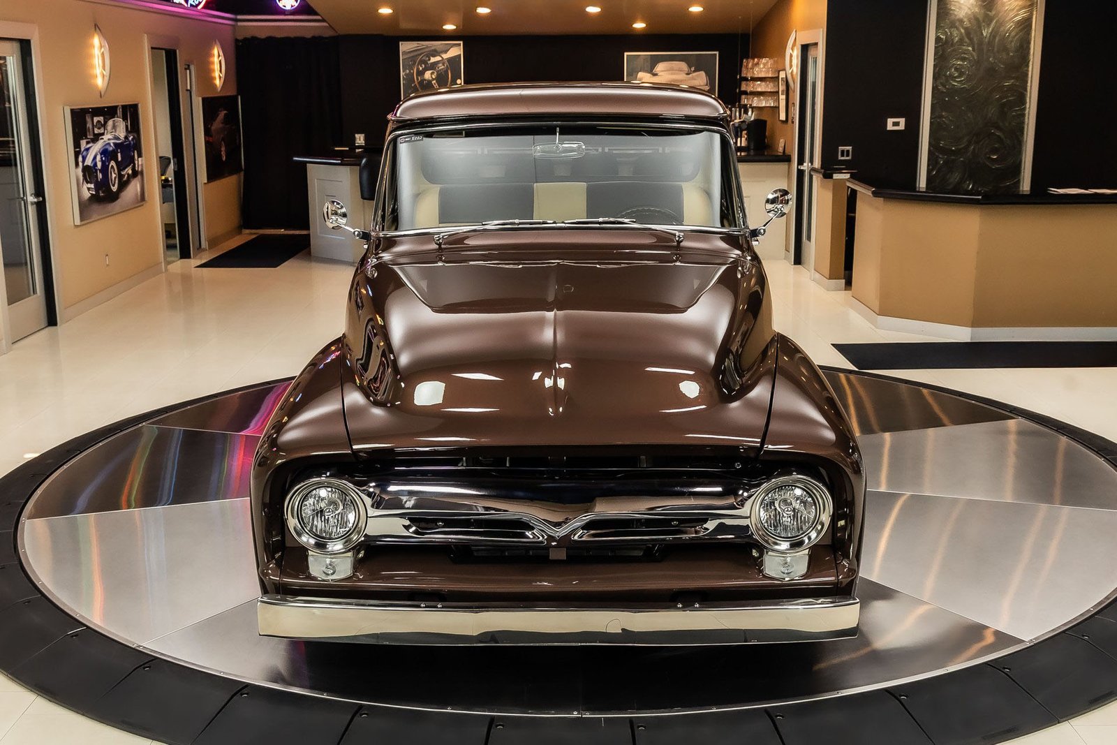 Finished in a rich Cherrywood Bronze exterior, the truck presents with a beautifully detailed body that highlights the iconic shape of the ’56 F100. Subtle custom touches, paired with polished trim and modern wheels, give it a refined appearance without losing its vintage character. The stance and overall presentation reflect the benefits of a frame-off build, resulting in a truck that looks purposeful from every angle.