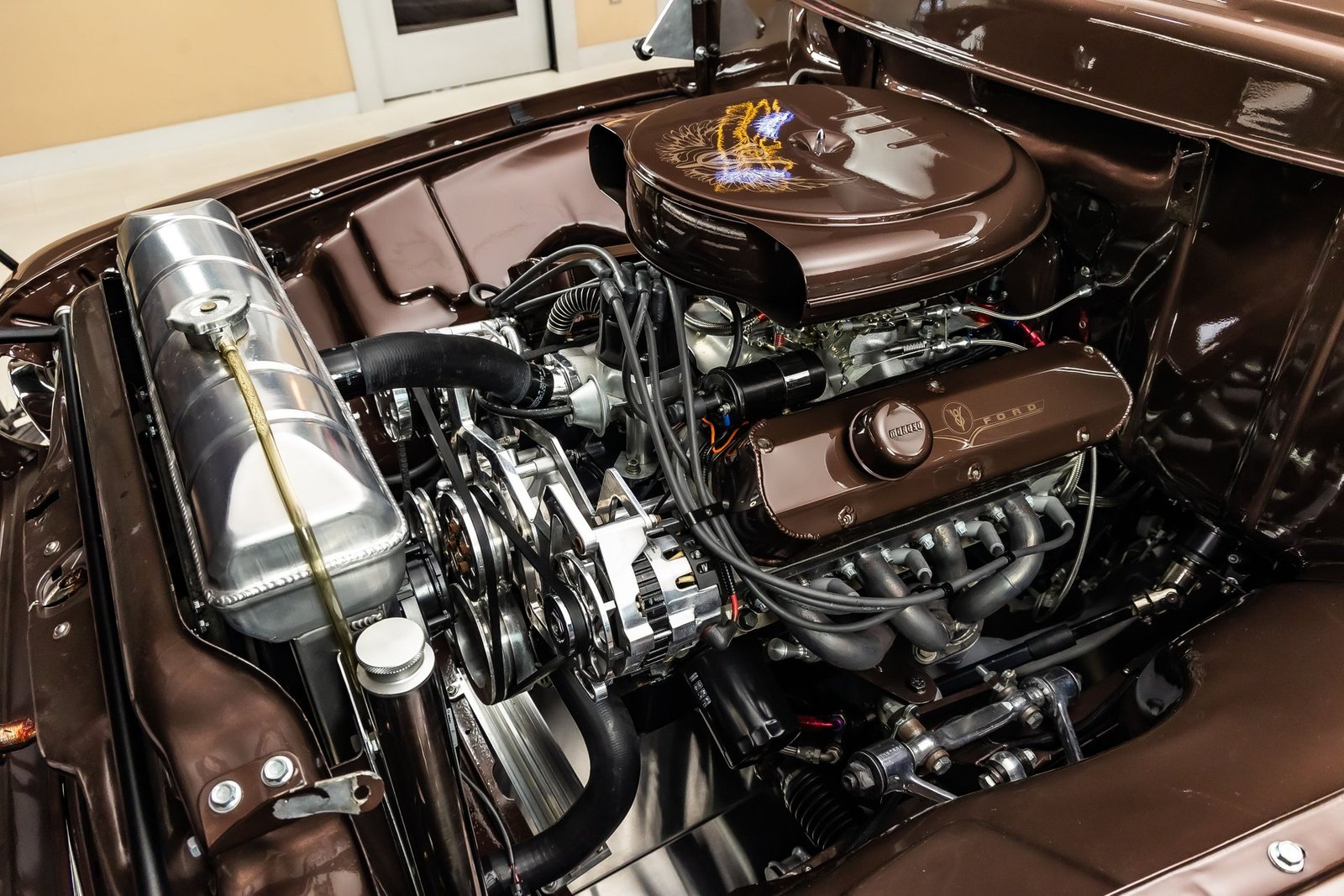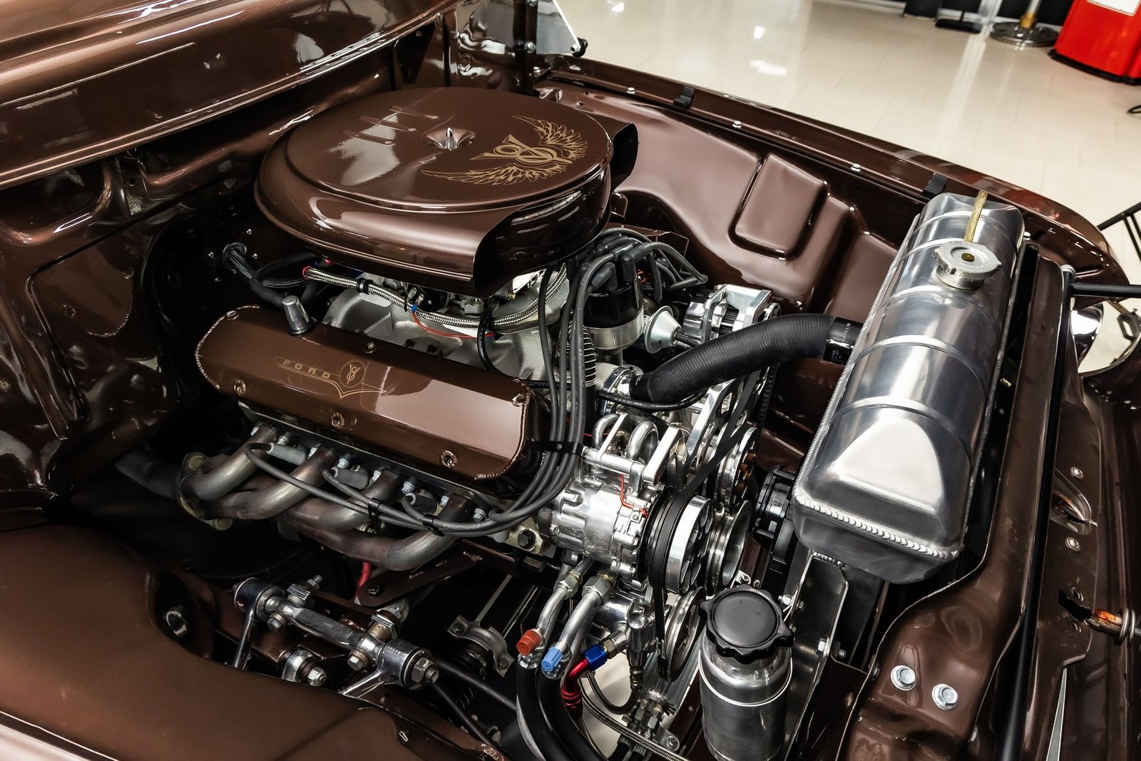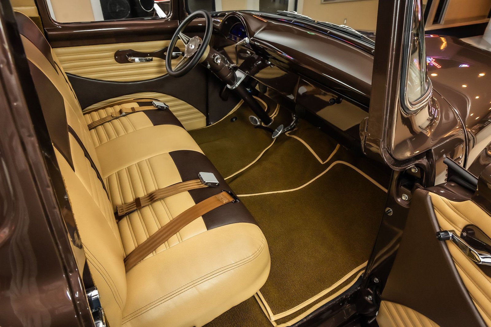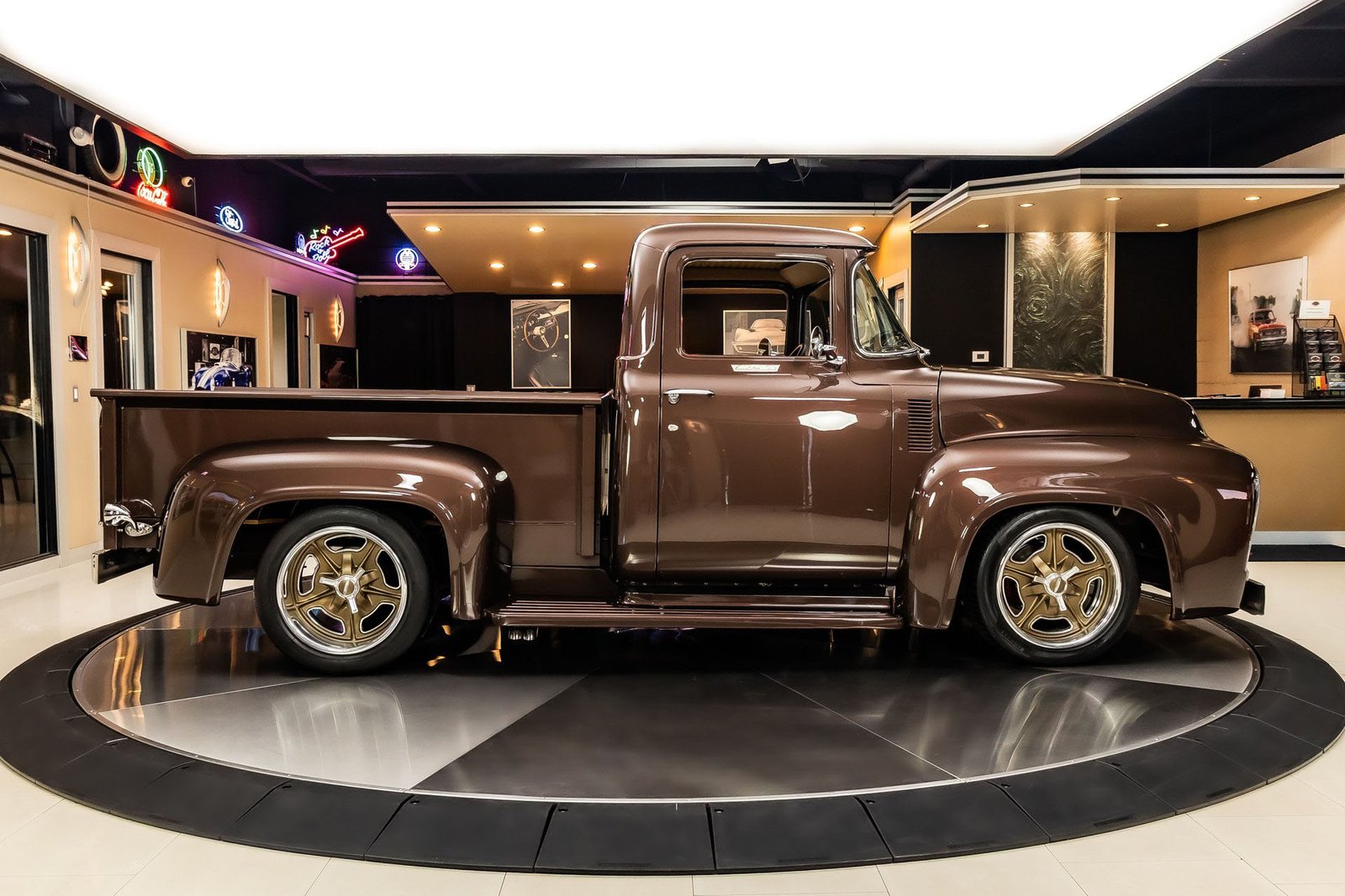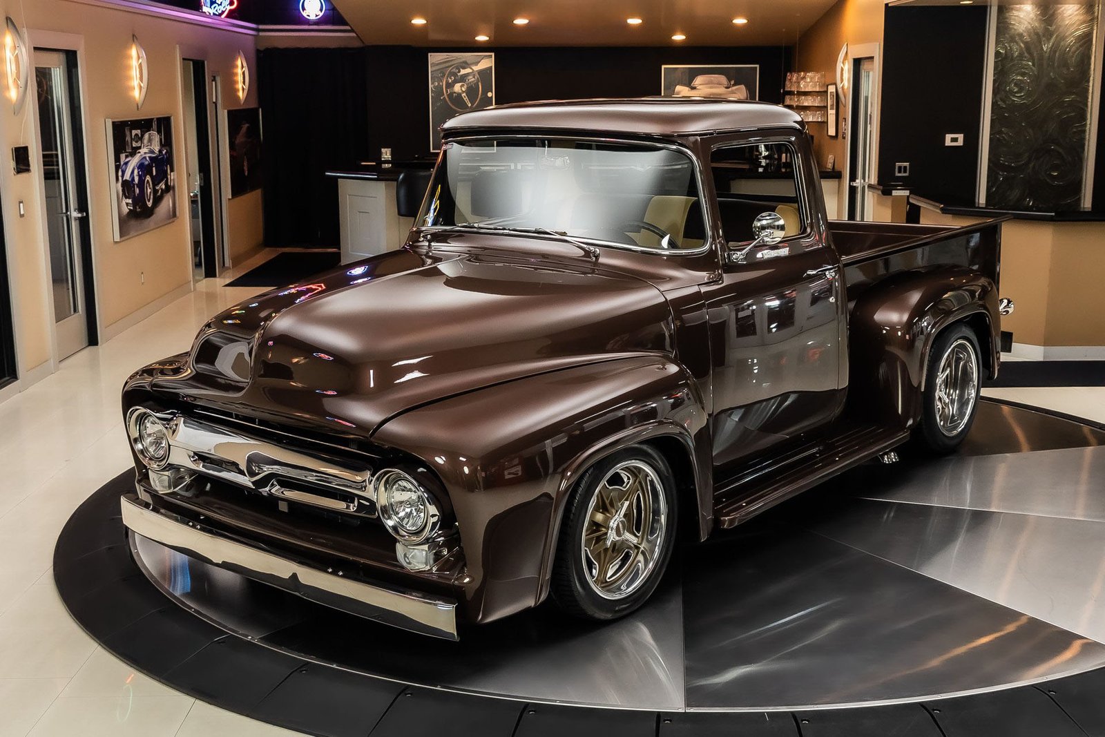 Finished in a rich Cherrywood Bronze exterior, the truck presents with a beautifully detailed body that highlights the iconic shape of the ’56 F100. Subtle custom touches, paired with polished trim and modern wheels, give it a refined appearance without losing its vintage character. The stance and overall presentation reflect the benefits of a frame-off build, resulting in a truck that looks purposeful from every angle.