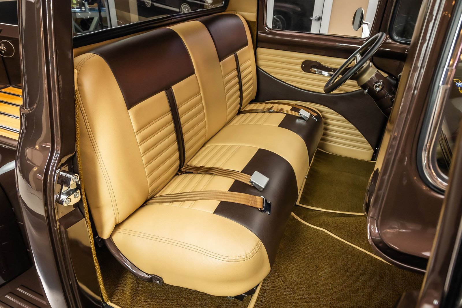 Inside, the cabin has been thoughtfully updated with custom brown and tan leather upholstery that complements the exterior color scheme. Modern conveniences such as air conditioning, power steering, and power windows enhance comfort, while a custom dashboard and upgraded steering column maintain a clean, driver-focused layout.