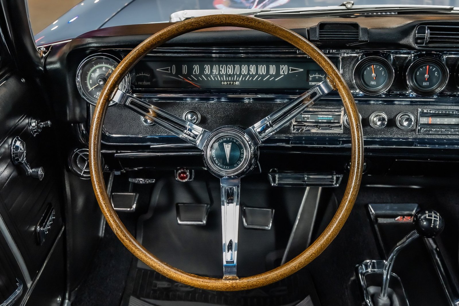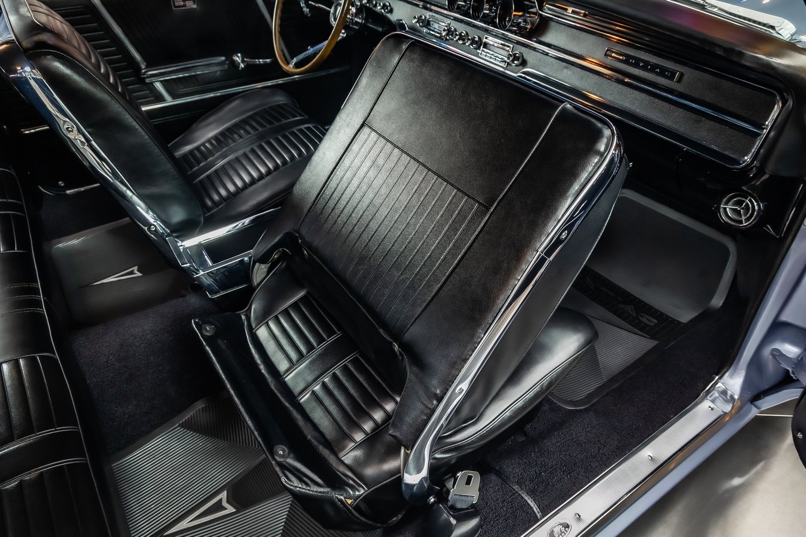 Inside, the black interior provides a sharp contrast to the exterior color and maintains a factory-inspired appearance. Bucket seats, a center console, and period-correct gauges create a driver-focused cockpit, while chrome accents and a classic three-spoke steering wheel add to the upscale muscle car atmosphere Pontiac was known for.